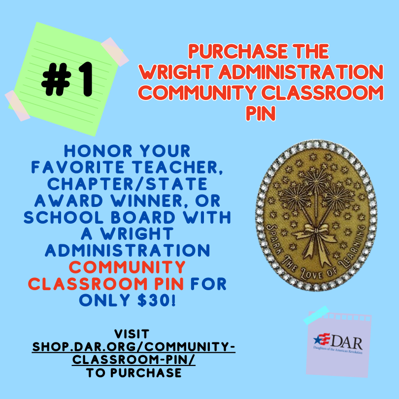 #1: Purchase the Wright Administration Community Classroom Pin: November is the perfect time to honor your favorite teacher, chapter/state award winner, homeschool co-op coordinator, or school board with a Wright Administration Community Classroom Pin (the first ever!) for only $30. Visit shop.dar.org/community-classroom-pin/ to purchase today. NEW this year, the Community Classroom Pin Challenge: States will be recognized with 1st, 2nd, and 3rd place certificates for the most Community Classroom pins purchased (as verified by the DAR Store).