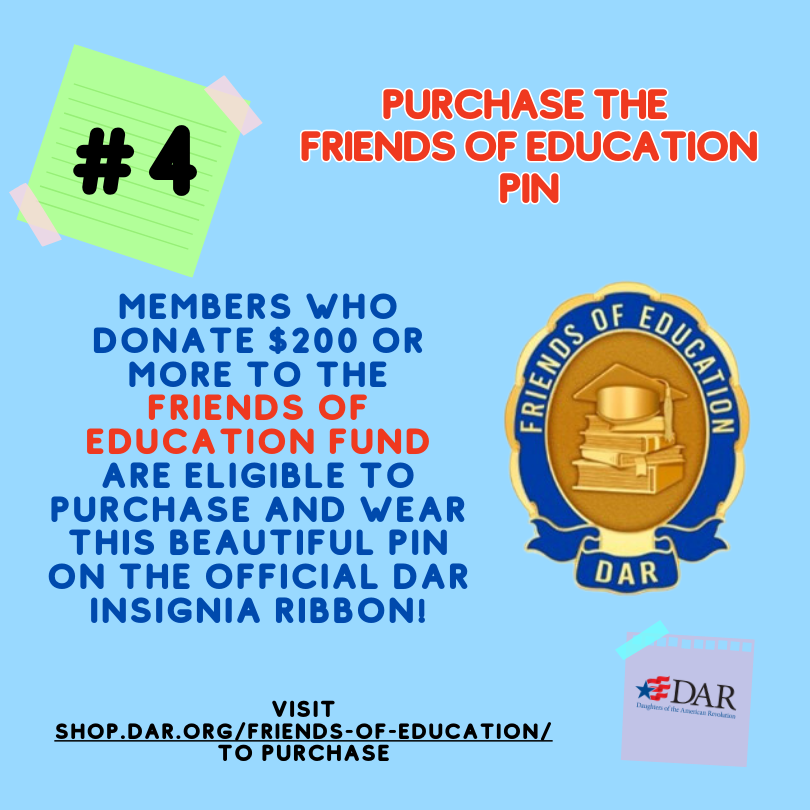 #4: Purchase the Friends of Education Pin: Members who donate $200 or more to the Friends of Education Fund are eligible to purchase and wear this beautiful pin on the official DAR Insignia ribbon! Visit https://shop.dar.org/friends-of-education/