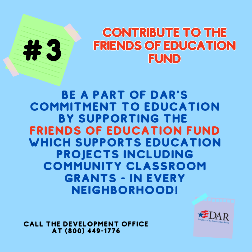 #3: Contribute to the Friends of Education Fund: Be a part of DAR's commitment to education by supporting the Friends of Education Fund, which supports education projects including Community Classroom Grants - in every neighborhood! Contact the Development Office today to learn more about how you can make a one time or recurring gift.
