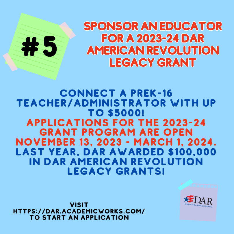#5: Sponsor an educator for a 2023-24 DAR American Revolution Legacy Grant: Connect a PreK-16 teacher/administrator with up to $5000, funded by the President General’s Project and the Friends of Education Fund! Applications for the 2023-24 grant program are open November 13, 2023 - March 1, 2024. Last year, DAR awarded $100,000 in DAR American Revolution Legacy Grants!