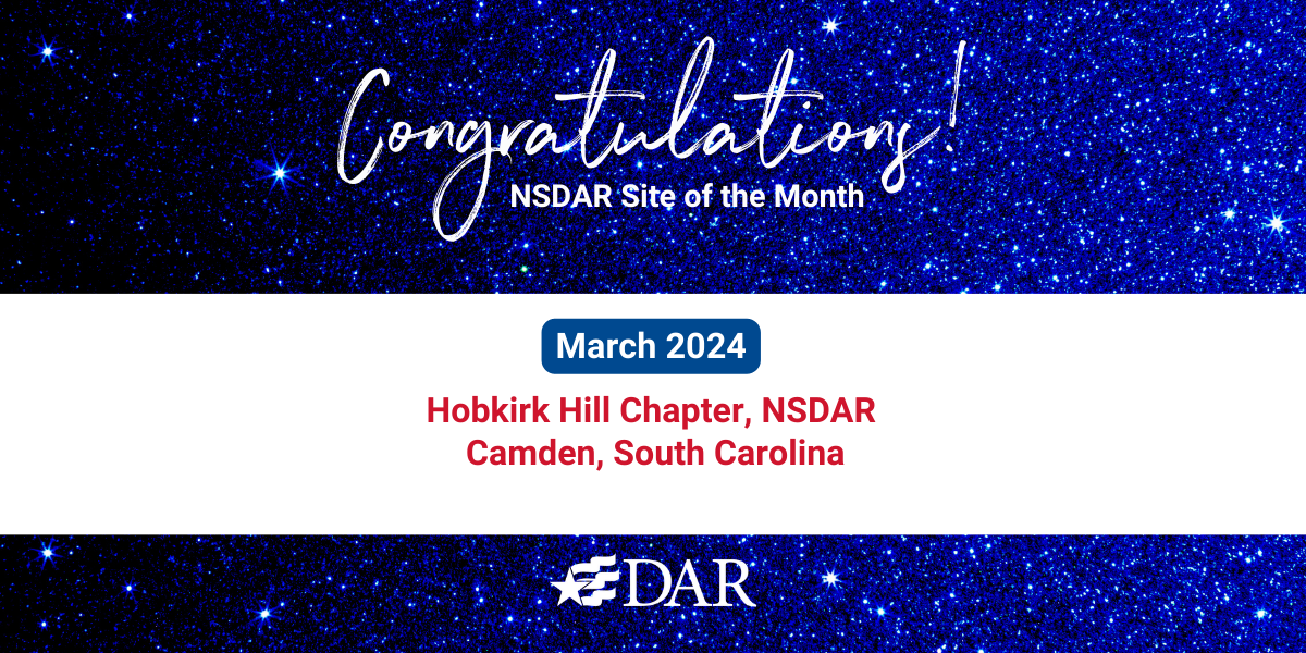 Congratulations to the Hobkirk Hill Chapter, NSDAR from Camden, South Carolina. Sixteen other websites were under consideration this month. We’re so pleased that so many chapters continue to create websites. What a wonderful way to introduce yourselves to your communities and to inspire new members.