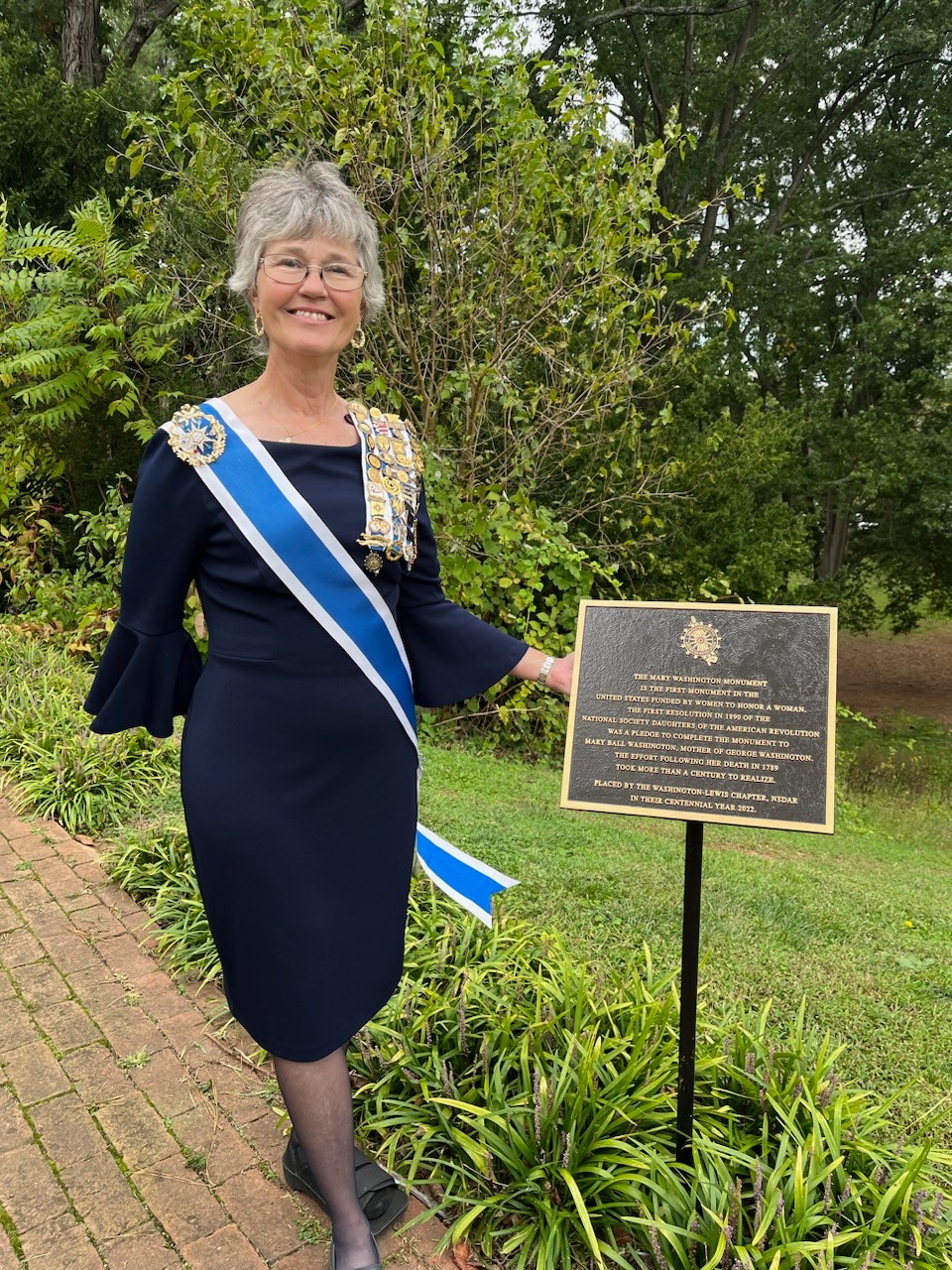 Historian General Suzanne M. Heske with the historical marker at the Mary Washington Monument.